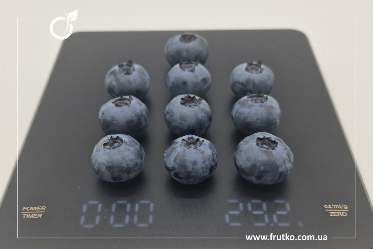 ✅ Ягода приплюснута, середнього розміру, вагою 2,2-2,8 г., має насичений десертний смак з ледь помітною кислинкою. Ягоди цього сорту мають порівняно високий вміст вітаміну С (45.26 mg mg %), мають високий вміст водорозчинних сухих речовин (14.22-16.70%), поліфенолів та антоціанів.